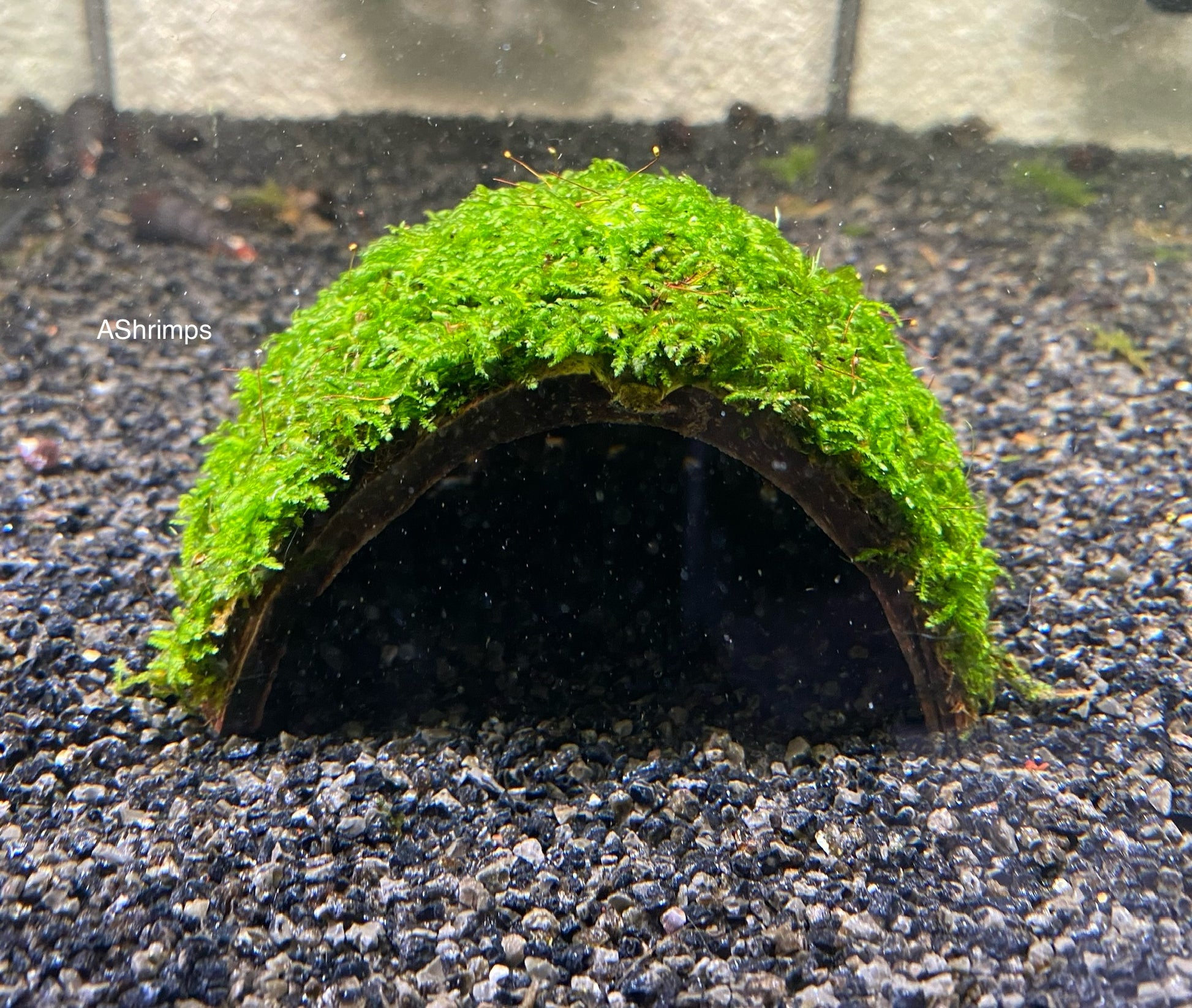Deze 1 gaats Kokosnoot met Javamos is een mooie natuurlijke en praktische toevoeging aan je aquarium. Het mos groeit vol en dicht op de halve kokosnoot en creëert een fijne schuilplek waar garnalen en vissen zich veilig voelen. Bovendien is het een ideale voedselplek voor garnalen! Er zit 1 gat in wat dient als in en uitgang.